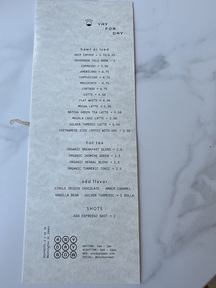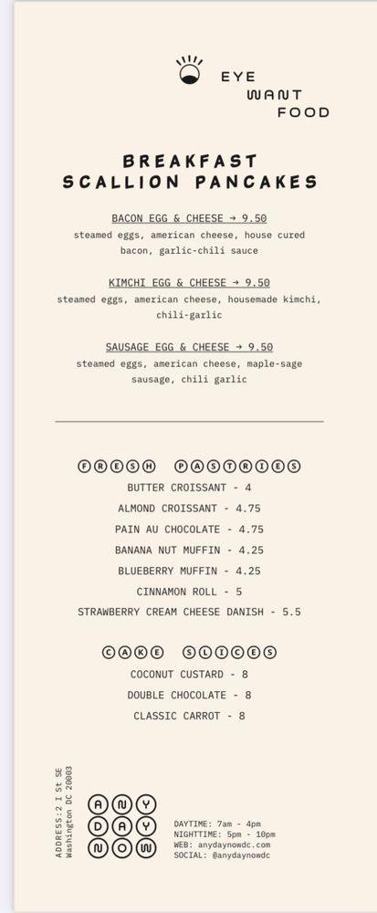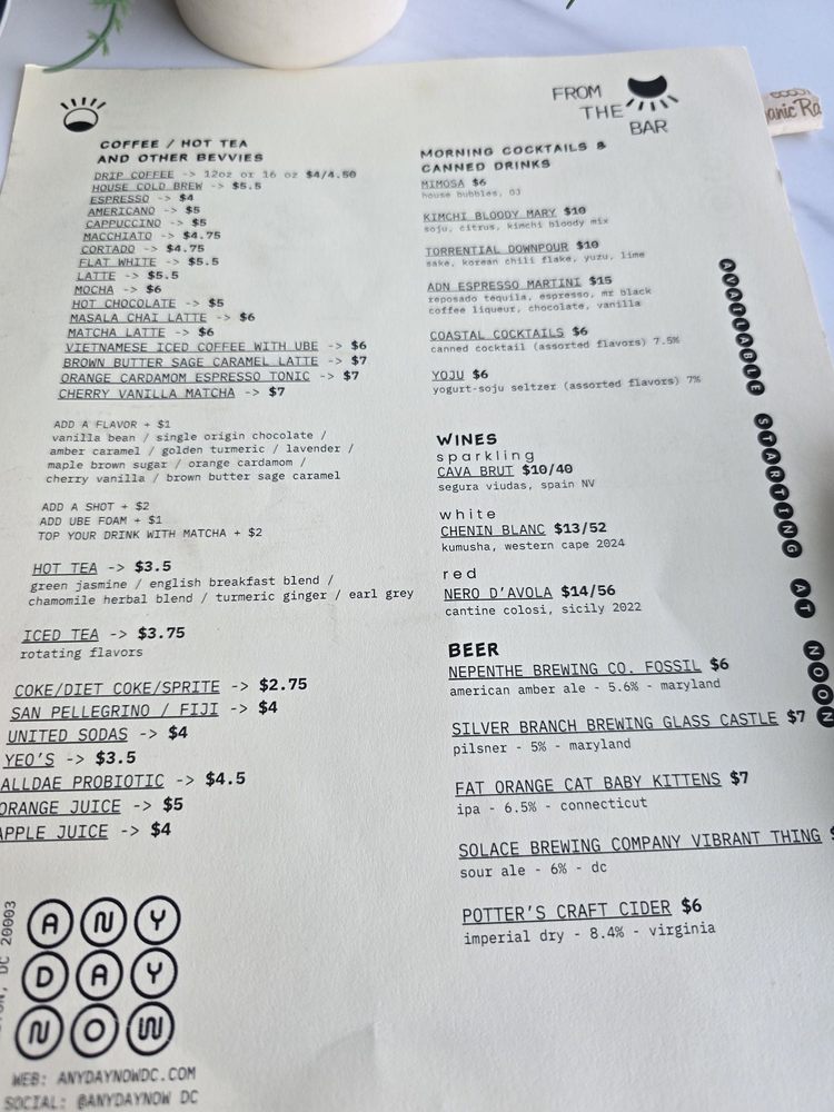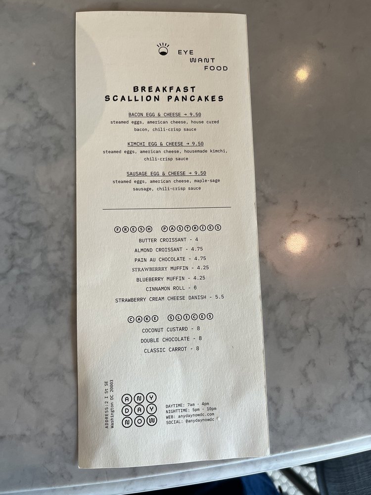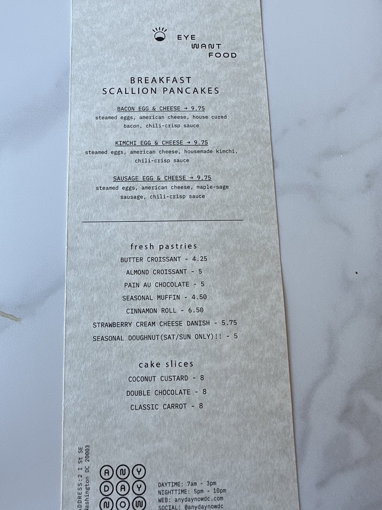 Any Day Now is a trendy patisserie and cafe located in Navy Yard, Washington, DC. This cozy spot offers an array of unique breakfast and brunch options, including scallion pancake breakfast sandwiches and innovative beverages like the ube latte. Customers rave about the creative dishes, such as the kimchi scallion pancake sandwich and miso-buffalo chicken sando. The ambiance is described as casual and comfortable, perfect for enjoying a treat or getting some work done. The menu also features a variety of bakery items and refreshing drinks like Vietnamese iced coffee with ube. With a focus on Asian-inspired cuisine and a commitment to excellent service, Any Day Now is a must-visit for food lovers in the area.