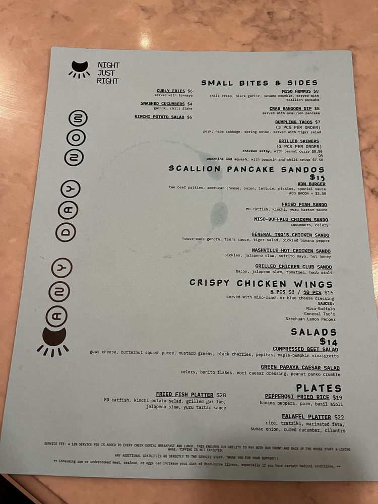MD catfish, kimchi, yuzu tartar sauce. served on scallion pancake.